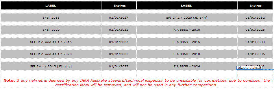 IHRA Australia Helmet Expiration
